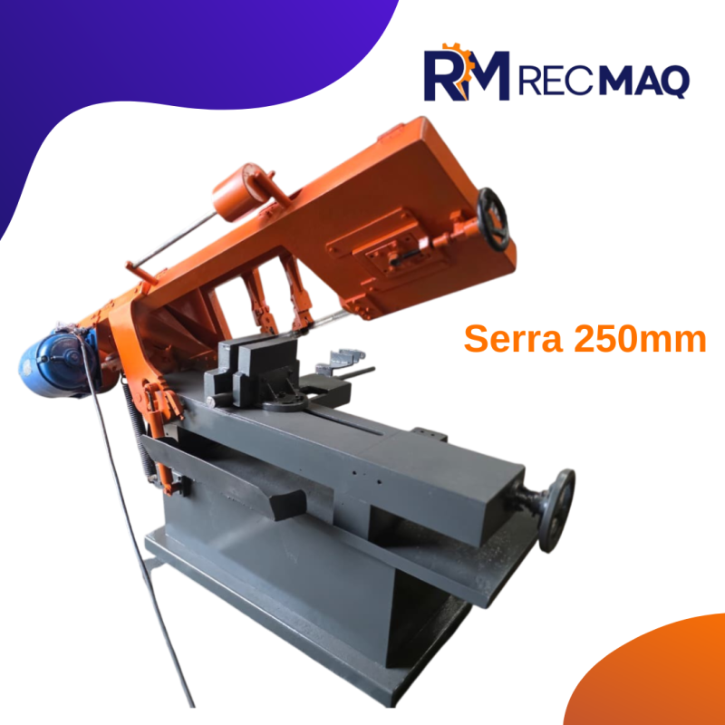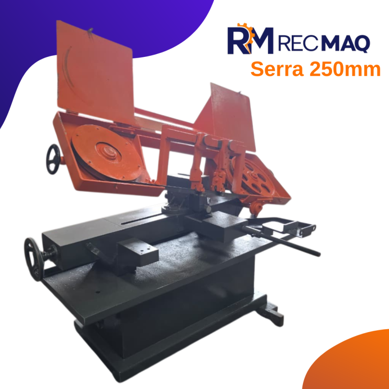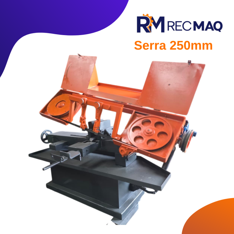 ESPECIFICAÇÕES TÉCNICAS Capacidade de corte: até 250 mm Tipo: Serra de fita horizontal Sistema de fixação: Morsa mecânica robusta Avanço de corte: Controlado (gravidade com regulagem) Transmissão: Por polias e correia Motor elétrico acoplado Estrutura: Base reforçada e alta estabilidade DIFERENCIAIS Equipamento totalmente revisado e pintado Excelente rigidez estrutural → cortes mais precisos Máquina simples, confiável...